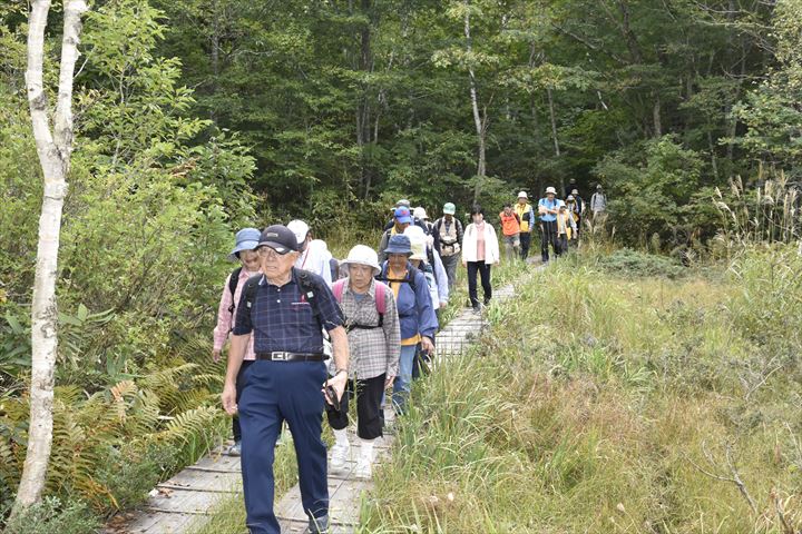参加者は、小尾瀬(こおぜ)と呼ばれる玉原湿原を一周する木道コースを、さわやかな高原の空気と景色を満喫しながら歩きました。